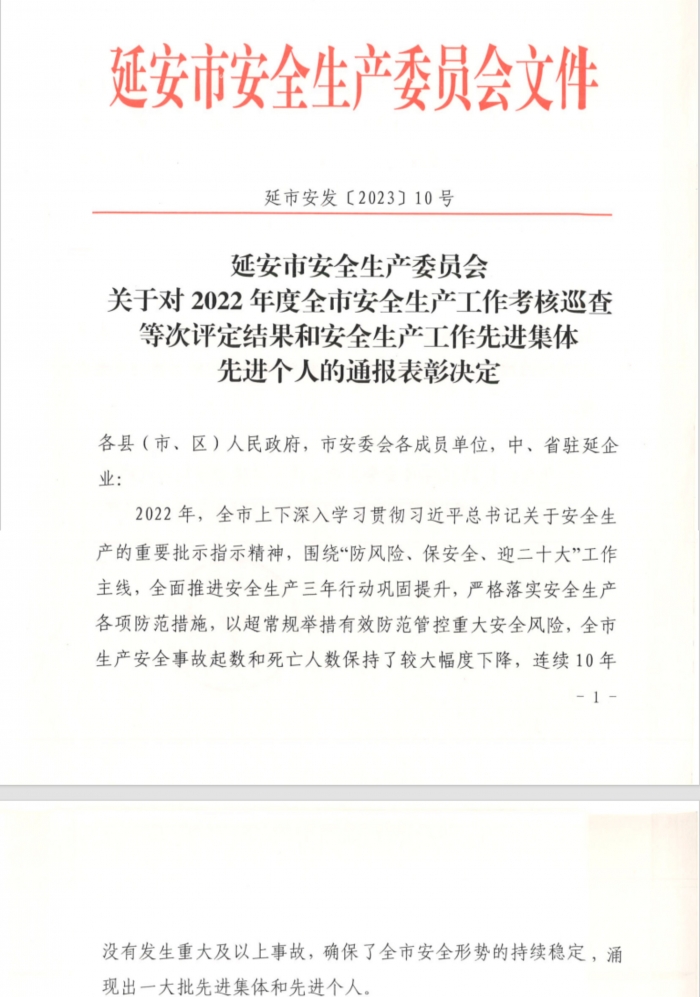 近日,延安市安全生產(chǎn)委員會(huì)表彰了2022年全市安全生產(chǎn)工作先進(jìn)集體和先進(jìn)個(gè)人,陜建十三建集團(tuán)獲評(píng)延安市安全生產(chǎn)先進(jìn)集體,這是集團(tuán)連續(xù)四年榮獲全市安全生產(chǎn)先進(jìn)集體表彰。