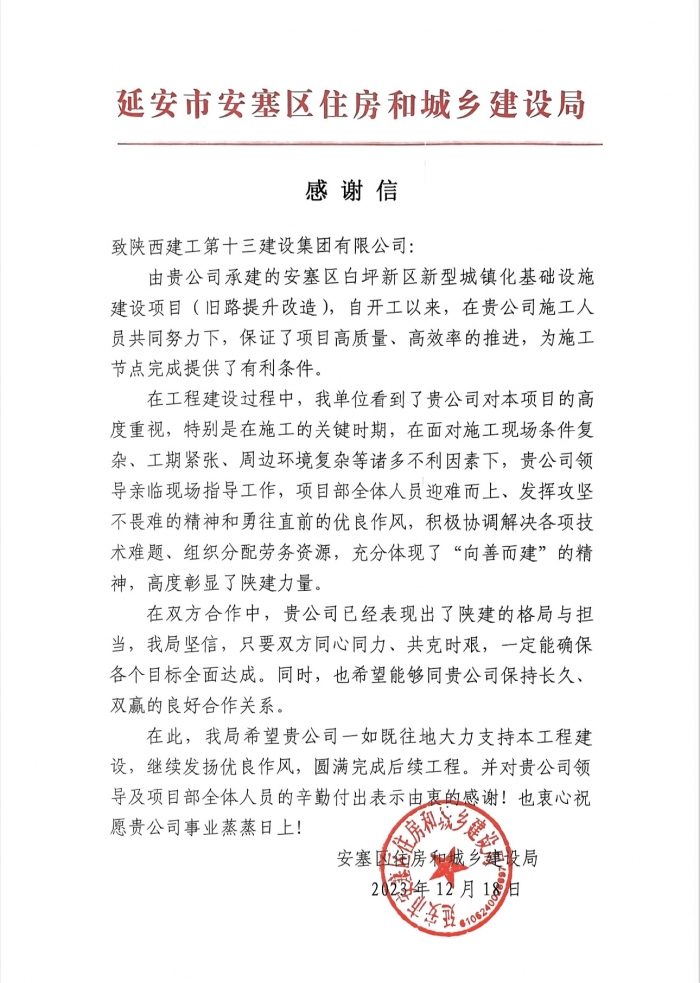 近日,集團(tuán)第一工程公司施工的安塞區(qū)白坪新區(qū)新型城鎮(zhèn)化基礎(chǔ)設(shè)施建設(shè)項(xiàng)目收到來自安塞區(qū)住建局的感謝信,對(duì)集團(tuán)項(xiàng)目部管理團(tuán)隊(duì)在施工過程中的迎難而上、攻堅(jiān)克難,高質(zhì)量、高效率推進(jìn)項(xiàng)目建設(shè)予以高度贊揚(yáng)。
